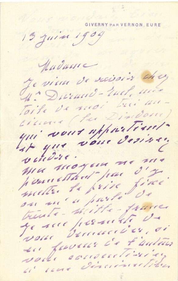 Mes moyens ne me permettant pas d'y mettre le prix fixé on m'a parlé de trente-mille-francs je me permets de vous demander, si en faveur de l'auteur vous consentiriez à une diminution. Vous voudrez bien Madame excuser la liberté de ma demande»... [Il s'agit du grand tableau Les Dindons [W416, Musée d'Orsay], peint en 1877 chez Ernest Hoschedé, qui en fut le premier propriétaire| il passa ensuite successivement chez Giuseppe de Nittis, Théodore Duret, puis François Depeaux, avant d'être acquis en 1906, à la vente Depeaux, par la princesse de Polignac.