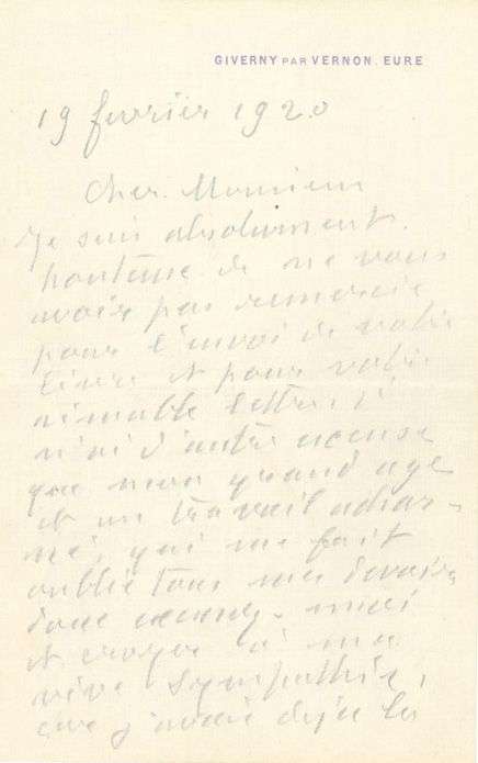 L.A.S. «Claude Monet», Giverny 19 février 1920, [à Emmanuel BOURCIER]| 2 pages et demie in-8 à son adresse, au crayon.