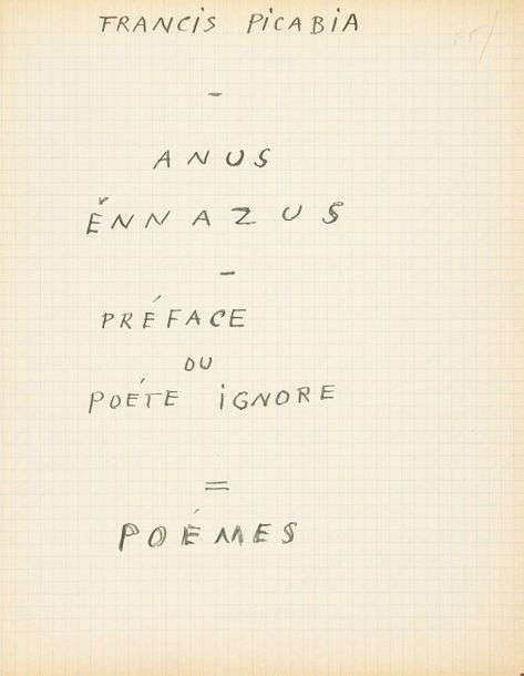 Première version du poème Ennazus.Écrit à l'encre noire au recto de feuillets d'un cahier de papier qua- drillé à petits carreaux, ce manuscrit est signé et daté en fin: «Francis Picabia/Rubingen 7 août 1946».Picabia a composé ce recueil de poèmes, longtemps resté inédit, pendant des vacances en Suisse, à Rubingen, dans la famille de sa femme Olga| ces textes sont le reflet des relations amoureuses tumul- tueuses de Picabia avec sa maîtresse Suzanne Romain (Ennazus est le renversement de Suzanne) [sur cette liaison, voir Carole Boulbès, Picabia avec Nietzsche. Lettres d'amour à Suzanne Romain (1944- 1948), Les Presses du réel, 2010]. Picabia en a établi un dactylogramme fautif, intitulé Ennazus, adressé en novembre 1946 à Christine Bou- meester, et qui fut publié en annexe des Lettres à Christine (Gérard Lebovici, 1988, p. 201-246), avant d'être recueilli dans les Écrits critiques (Mémoire du Livre, 2005, p. 625-671). Ce manuscrit en donne une version antérieure, avec d'importantes variantes. [1] Titre: «FRANCIS PICABIA /-/ANUS/ÉNNAZUS/-/PRÉFACE/DU/POÈTE IGNORÉ/=/POÈMES».[2-3] Préface, signée en fin: «Le poëte ignoré», dans une version différente du texte publié: «Francis Picabia est toujours resté lui- même au milieu des écrivains et des peintres-Tout ce qui touche à son coeur, à son indépendance se heurte, depuis son enfance avec les hommes, il est en conflit en lutte avec le monde-Ses adversaires ne désarment pas| chacun d'eux épiant ses faiblesses. Et pourtant c'est son chemin depuis des années qui nous conduit à l'affranchissement»... Citons encore la conclusion: «Le problème qui se pose maintenant est celui-ci: à supposer que Francis Picabia ne causât pas le moindre préjudice à personne, je devrais néanmoins déployer tout mon zèle à le combattre./Pourquoi?/Parce que je suis plein d'absurde mor