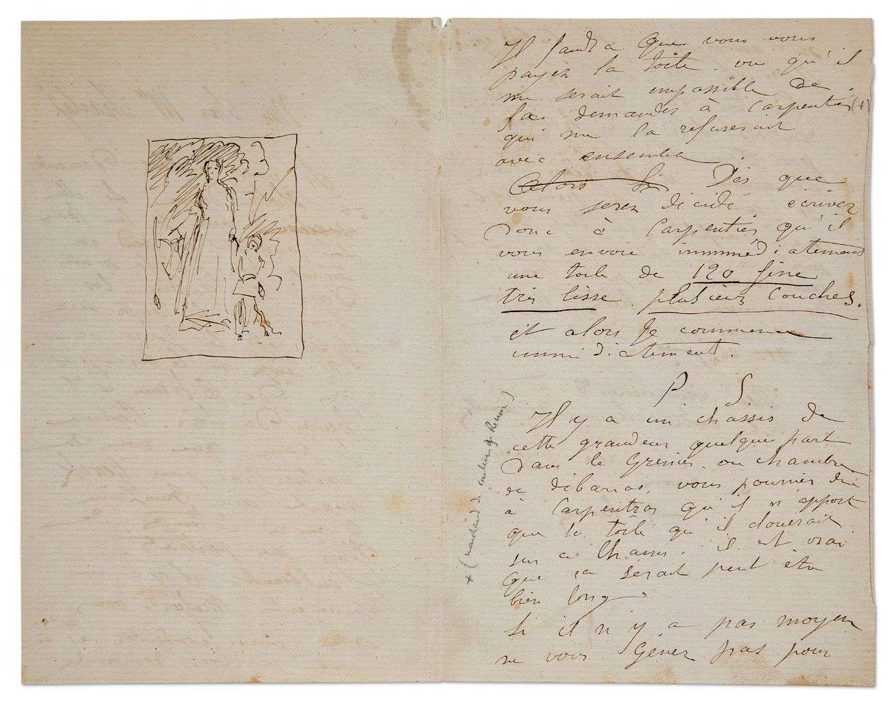 Exceptionnelle lettre avec dessin à la plume d'un projet de tableau. [C'est grâce à son ami intime le peintre Jules Le Coeur que Renoir fit la connaissance de son frère l'architecte Charles LE COEUR (1830-1906), qui fut l'un des premiers et plus importants mécènes de Renoir. Le Coeur lui confia notamment en 1868 la décoration de l'hôtel particulier qu'il construisait pour le prince Bibesco. Le peintre réalisa plusieurs toiles représentant Charles Le Coeur et sa famille, sa mère, sa femme, ses filles et son fils Joseph dit «Jo».] «Mon cher Mr Charles