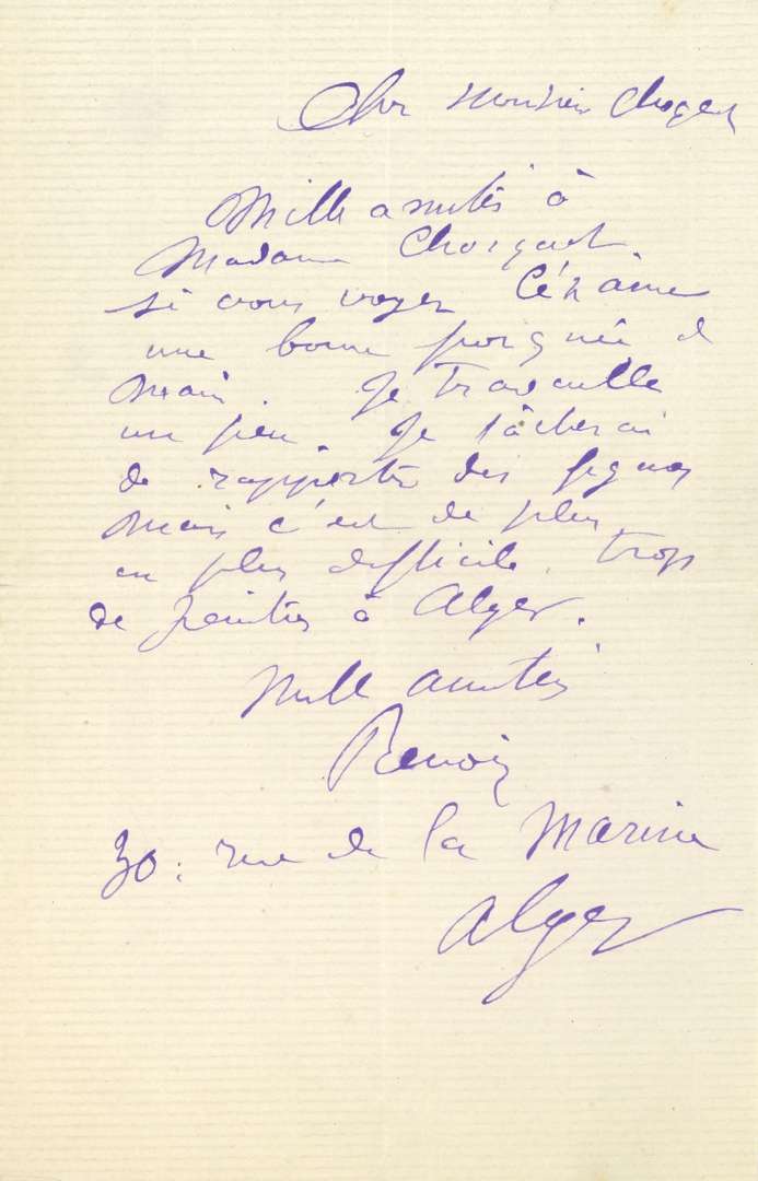 Lettre d'Alger à son ami le collectionneur Victor Chocquet. ... «Si vous voyez CÉZANNE une bonne poignée de main. Je travaille un peu. Je tâcherai de rapporter des figues mais c'est de plus en plus difficile, trop de peintres à Alger»... Il donne son adresse: «30, rue de la Marie Alger».