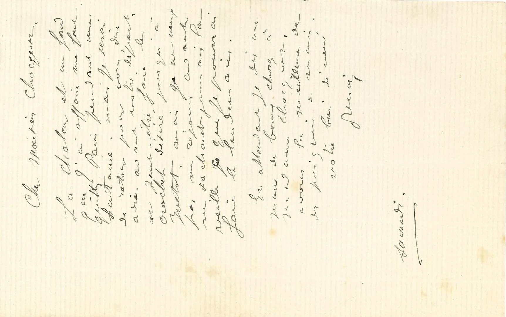 À son ami le collectionneur Victor Chocquet. «La chaleur et un fond que j'ai affaire me font quitter Paris pendant une huitaine. Mais je serai de retour pour vous dire adieu avant votre départ, et peut-être faire le crochet désiré jusqu'à Yvetot, mais je ne veux pas me réjouir avant ne sachant jamais la veille ce que je pourrai faire le lendemain»...
