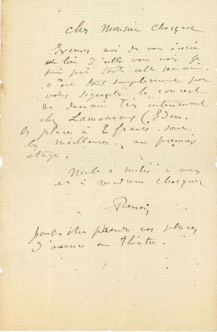 Il ne peut aller le voir, car il est «pris toute cette semaine», mais veut lui «signaler le concert très intéressant chez Lamoureux (Eden). Les places à 2 francs sont les meilleures, au premier étage»... «Je suis obligé de dîner ce soir à Chatou. Je vous prie de m'excuser de ne pas pouvoir faire partie de votre réunion intime ce soir»...
