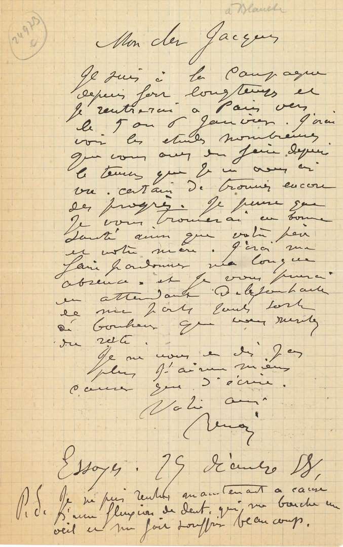 L.A.S. «Renoir», Essoyes 29 décembre 1888, à Jacques-Émile BLANCHE| 1 page in-8.