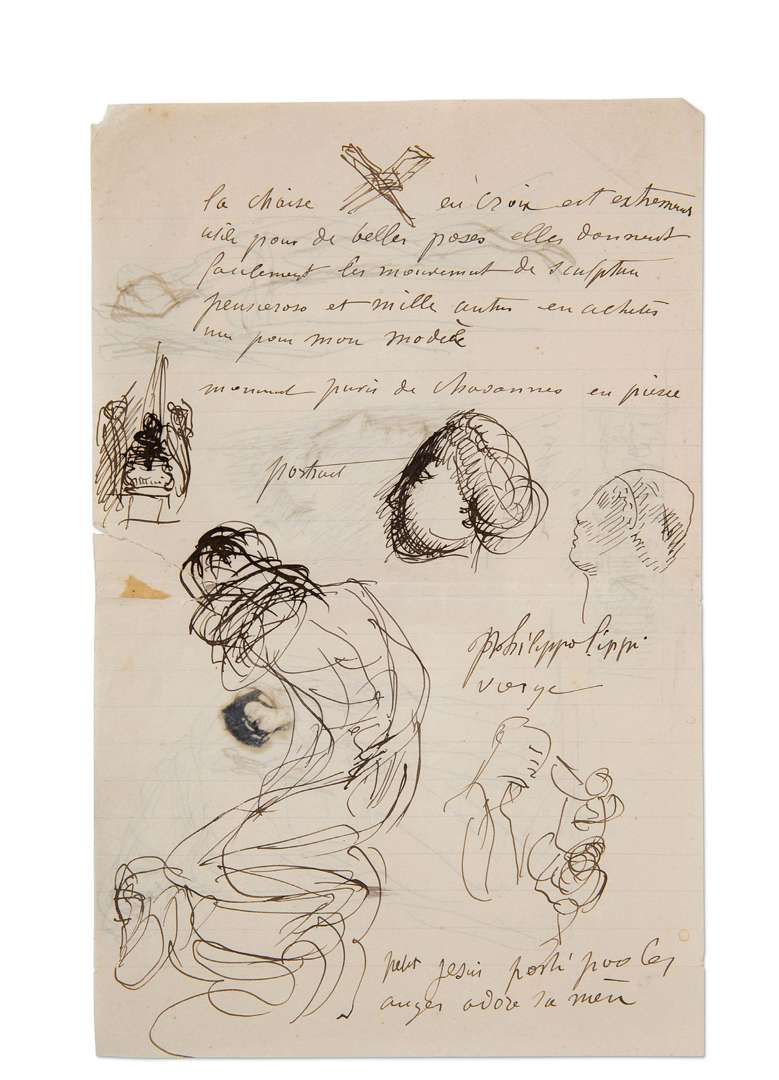 Feuillet d'esquisses à la plume et de notes. «La chaise [croquis] en croix est extrêmement utile pour de belles poses elles donnent facilement les mouvements de sculpture Penseroso et mille autres en acheter une pour mon modèle».