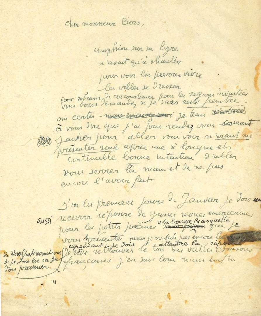 Après un quatrain («Amphion sur sa lyre»...), «refrain de circonstance pour les régions dévastées», il répond à Bois: «Vous vous demandez si je suis resté peintre. Oui certes». Avant d'aller le voir, il lui présente des «petits poèmes “à la bonne franquette”», pour lesquels il attend une réponse de revues américaines. «Je rêve retrouver le ton des vieilles chansons françaises [...] J'ai comme un remords de ne pas avoir tâté ici en France les éditeurs mais je n'ai pas le temps matériel de me déranger à cause des travaux en cours. D'ici douze mois j'aurai un millier de ces petites feuilles que je vous adresse, certaines datent de vingt ans. Il y en a sur 1° Ténèbres. 2° Paix. 3° Crayons d'Ingres. 4° Stella matutina. 5° Stella vespertina. 6° Cirque. 7° Océan etc. etc.» Il se demande si cela peut faire «un gros, très gros tirage [...] Sans être d'un nationalisme agressif j'ai comme un regret que cela s'en aille chez des gens peut-être ? hostiles ! car je sens là tout de même un fond français [...] Il me faudra au moins dix mois pour remettre tout au net. À ce moment là on pourra publier régulièrement mais je ne puis m'engager pour le moment soit journal ou revue à un travail régulier - j'ai trop à faire - même une fois par semaine, mais dans l'avenir cela sera possible». Il tient cependant à réserver ses droits d'auteur, «car il en sera fait de petits recueils légers de 40 à 60 pages après publication dans les journaux ou revues»...