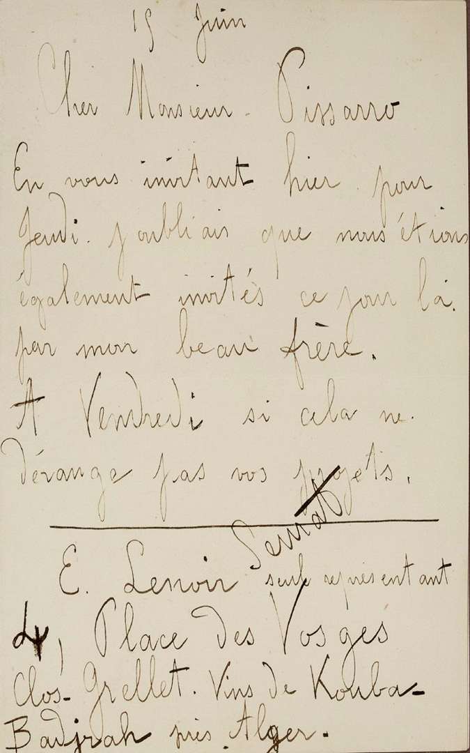 Très rare lettre de Seurat à Pissarro. «Cher Monsieur Pissarro En vous invitant hier pour Jeudi, j'oubliais que nous étions également invités ce jour là par mon beau-frère. À Vendredi si cela ne dérange pas vos projets». Il ajoute au bas de la lettre l'adresse d'E. Lenoir, représentant en vins du Clos-Grellet à Kouba-Badjrah près d'Alger.