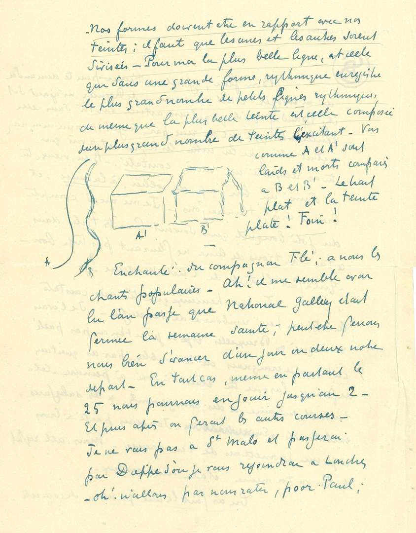 Puis il parle de leur prochain voyage en Angleterre, s'inquiétant de la fermeture de la National Gallery pendant «la semaine sainte»... «Je ne vais pas à St Malo et passerai par Dieppe d'où je vous rejoindrai à Londres»...