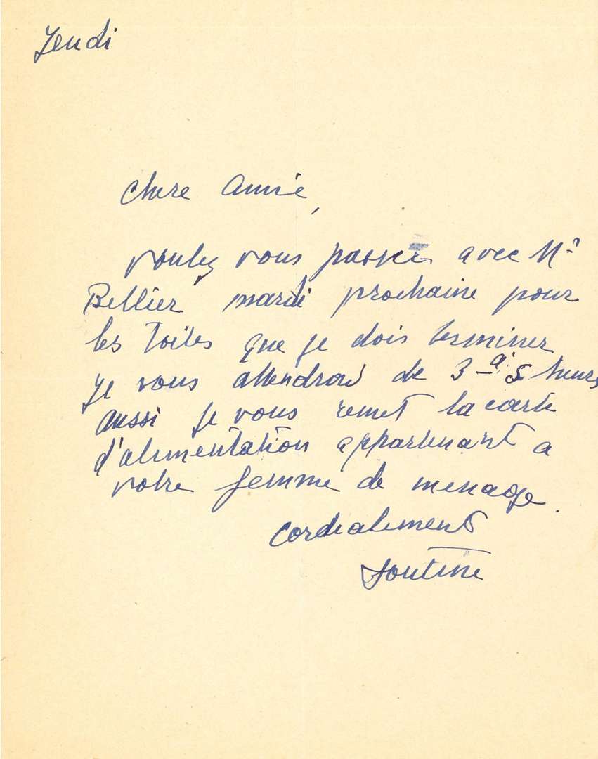 L.A.S. «Soutine», Jeudi [1941 ?], à une «chère amie»| 1 page in-4 à l'encre bleue. «Voulez-vous passer avec Mr Bellier mardi prochaine pour les toiles que je dois terminer. Je vous attendrai de 3 à 5 heures. Aussi je vous remet la carte d'alimentation appartenant à votre femme de ménage»... [Il s'agit du commissaire-priseur Alphonse BELLIER (1886-1980), qui officia des années 1920 aux années 1950.]