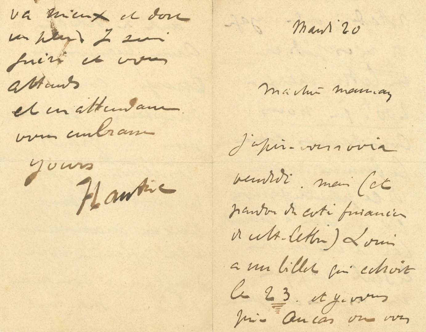 L.A.S. «HTLautrec», Mardi 20 [décembre 1892], à SA MÈRE, la comtesse Adèle de TOULOUSE-LAUTREC| 3 pages et demie in-8 (un peu fendue au pli central). «Ma chère Maman, J'espère vous voir vendredi, mais (et pardon du côté financier de cette lettre) Louis [Pascal] a un billet qui échoit le 23, et je vous prie au cas où vous retarderiez votre voyage de m'expédier auplusviteen lettre chargée 200 F que nous considérerons comme le dernier arriéré de ce pauvre garçon qui est bien à plaindre, car il est encor le seul qui gagne un fixe - courageusement. Paul se débat avec beaucoup d'énergie contre les directeurs de journaux mais sans grands résultats. Je pense que vous ne trouverez aucun inconvénient à ce règlement dont d'ailleurs, je vous avais parlé. Ma tante [Cécile Pascal] va mieux et dort un peu. Je suis guéri et vous attends, et en attendant vous embrasse»...