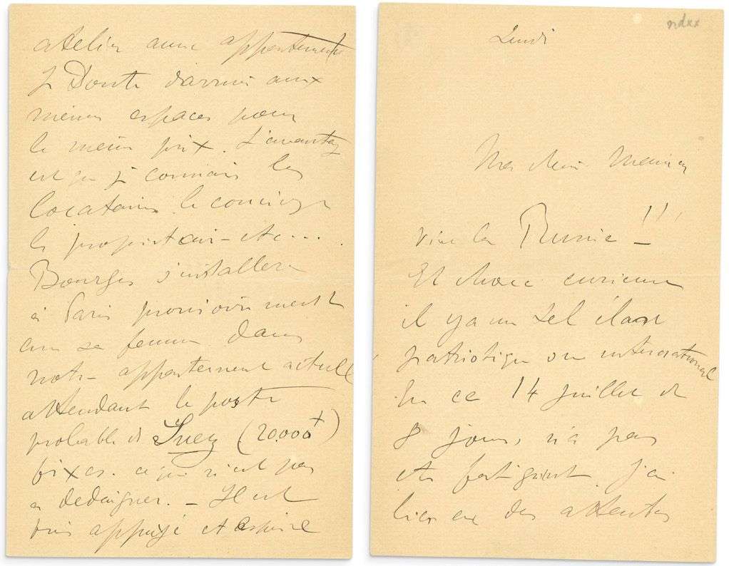 Longue lettre sur les festivités franco-russes, et son prochain aménagement dans son atelier de la rue Tourlaque. [Dans le cadre de l'amitié franco-russe, la visite officielle d'un amiral russe et son escadre en octobre 1893 a donné lieu à de grandes festivités. En janvier 1894, Toulouse-Lautrec va emménager dans son nouvel atelier de Montmartre, au 7 rue Tourlaque. La fin de la lettre fait allusion à l'affiche qu'il fait pour annoncer la parution en feuilleton dans Le Matin des mémoires de l'abbé Faure, Au pied de l'échafaud.] «Ma chère Maman, Vive la Russie !!! Et chose curieuse il y a un tel élan patriotique ou international que ce 14 juillet de 8 jours n'a pas été fatigant. J'ai bien eu des attentes de quelques demi-heures par ci par là à supporter. Mais il s'agissait de l'équilibre Européen et j'ai fait bonne figure. - Les sergents de ville eux-mêmes ont tâché d'être aimables et ce n'est pas peu dire. Enfin ils partent demain, probablement bien fatigués. Maintenant parlons sérieusement. J'ai loué pour un an au prix de 800 F l'appartement du rez de chaussée de la maison contiguë à mon atelier. Même propriétaire, - ce qui me permet de voir venir. Soit louer le rez de chaussée de mon atelier, mêmes conditions, et m'installer complètement, ou trouver un autre atelier avec appartement. Je doute d'arriver aux mêmes espaces pour le même prix. L'avantage est que je connais les locataires, le concierge, le propriétaire, etc... Bourges s'installera à Paris provisoirement avec sa femme dans notre appartement actuel, attendant le poste probable de Suez (20.000 F) fixes, ce qui n'est pas à dédaigner. - Il est très appuyé et espère l'avoir. Si vous pouvez me faire cadeau de 6 nappes de petites dimensions et quelques serviettes de table vous m'obligeriez beaucoup, car je vais être obligé de me monter. Je garde mon ancienne bonne et trouve qu'avec une quarantaine de f. par mois de dépense j'ai tout avantage, raccomodé et déjeunant chez moi. Je compte prendre possession de mon logement à la fin de Janvier, car on va le remettre à neuf, sous ma direction.