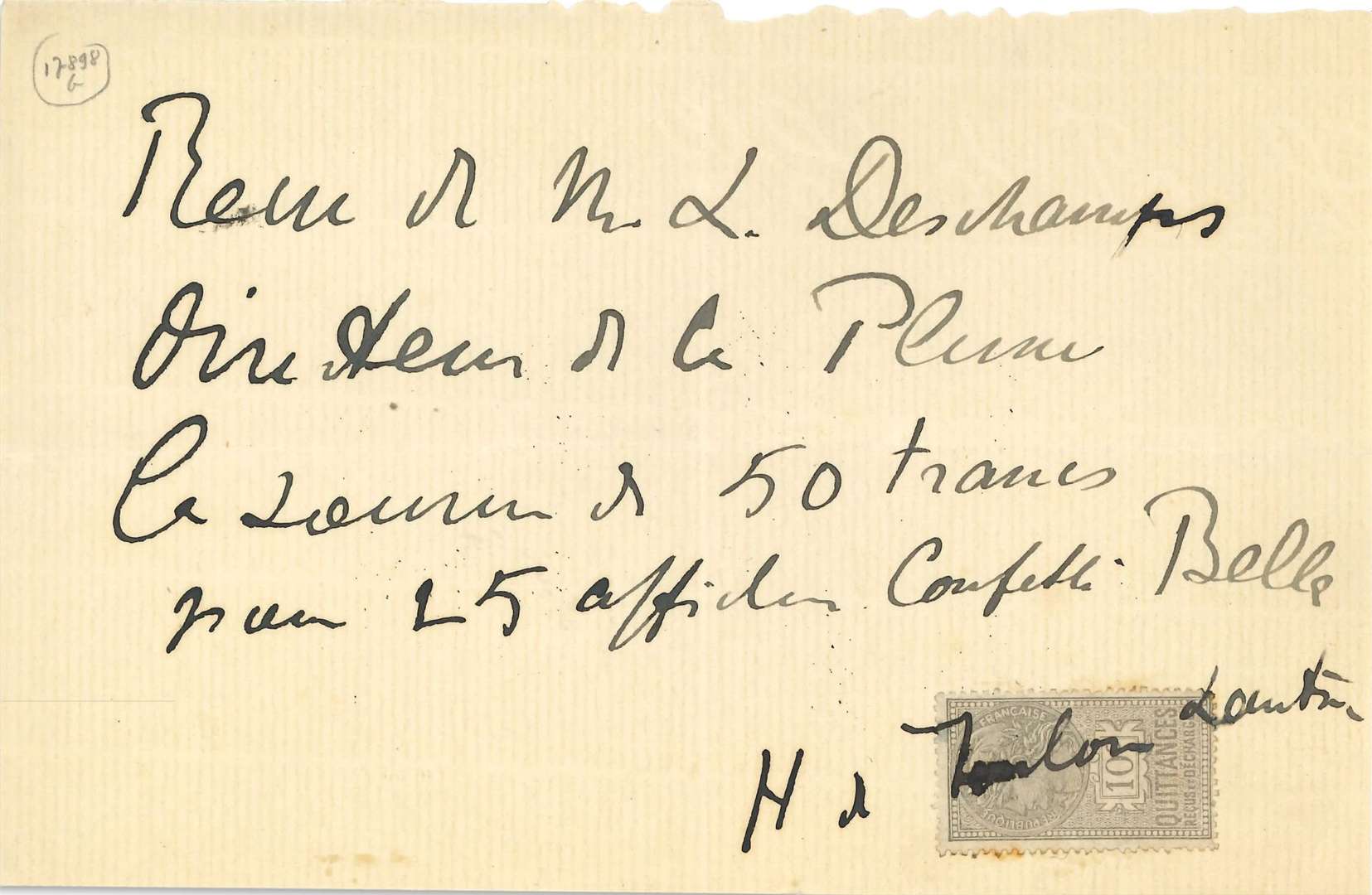 P.A.S. «H. de Toulouse Lautrec», [Paris février 1895]| 1 page oblong in-8 avec timbre fiscal. «Reçu de M. L. Deschamps directeur de la Plume la somme de 50 francs pour 25 affiches Confetti Bella». Et il signe sur le timbre fiscal. [Léon DESCHAMPS (1863-1899), rédacteur en chef de la revue La Plume, organisateur du Salon des Cent, éditait aussi des estampes et des affiches, dans le cadre de la société des Affiches artistiques de La Plume. Il s'agit ici de l'affiche Confetti pour la manufacture Bella de Londres.]