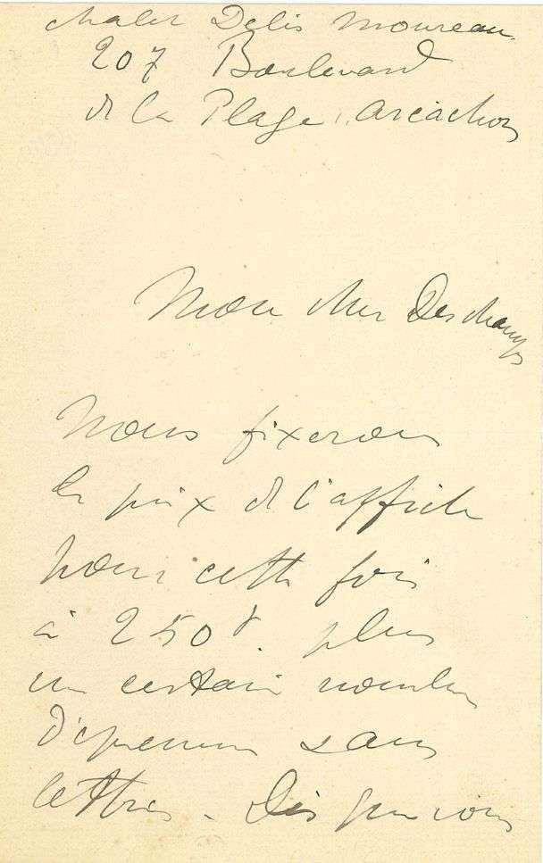 Au sujet de sa fameuse affiche The Chap Book, représentant l'Irish and American Bar de la rue Royale. [Léon Deschamps, rédacteur en chef de La Plume, éditait également des estampes et des affiches.] «Mon cher Deschamps, Nous fixerons le prix de l'affiche pour cette fois à 250 F plus un certain nombre d'épreuves sans lettres. Dès que vous aurez l'argent envoyez-le-moi ici. Avez-vous des nouvelles du journal allemand [la revue Pan] ? Écrivez-lui s.v.p. En tout cas tenez-moi au courant». Il demande des nouvelles de Gustave Pellet (éditeur et marchand de gravures), Jules Roques (directeur du Courrier français) et de Félicien Rops.