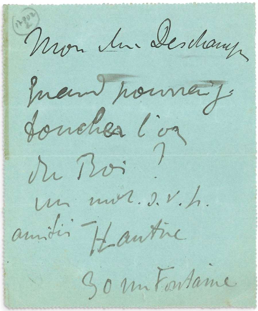 3 L.A.S. «HTLautrec», [Paris mars-juillet 896], à Léon DESCHAMPS| 1 page in-12 (télégramme) et 2 pages oblong in-12 (cartes-télégrammes), adresses au verso. [14 mars]. «Mon cher Deschamps, Quand pourrai-je toucher l'or du Roi ?»... Il donne son adresse «30 rue Fontaine». [21 avril]. «Si on porte 25 bout. de champagne à 1F,25 la bout. à mon nom payez je vous prie et louez des verres pour le boire»... [11 juillet]. «Envoyez donc prendre l'affiche et le tableau [sans doute La Passagère du 54]. Lundi on ferme à midi et vous ne trouverez personne. Dès que vous aurez reçu des argents du Chap Book prévenez-moi»...
