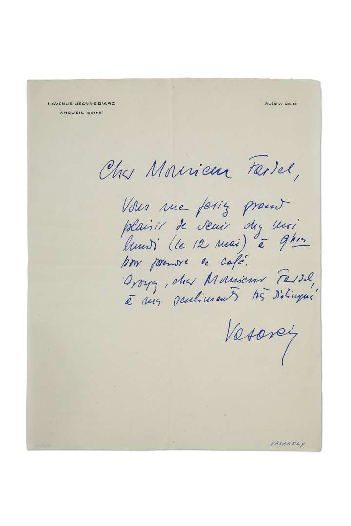 Lettre autographe signée de Victor VASARELY, invitation à prendre le café.