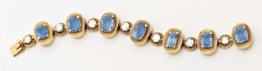 Bracelet articulé en or jaune ciselé et platine composé d'une alternance de motifs chacun sertis d'un important saphir et de maillons ronds plus petits sertis d'un diamant taillé en rose. Signé et numéroté. Dans un écrin. Long: 18 cm