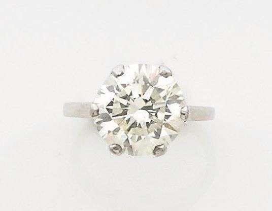 Bague en platine et or gris ornée d'un diamant solitaire de taille moderne. Diamant accompagné d'un certificat du laboratoire français de gemmologie datant du 14/11/2011 et précisant le poids: 5.14 carats Couleur J Pureté VS1 * Lot visible uniquement sur rendez vous: 01 41 92 06 42