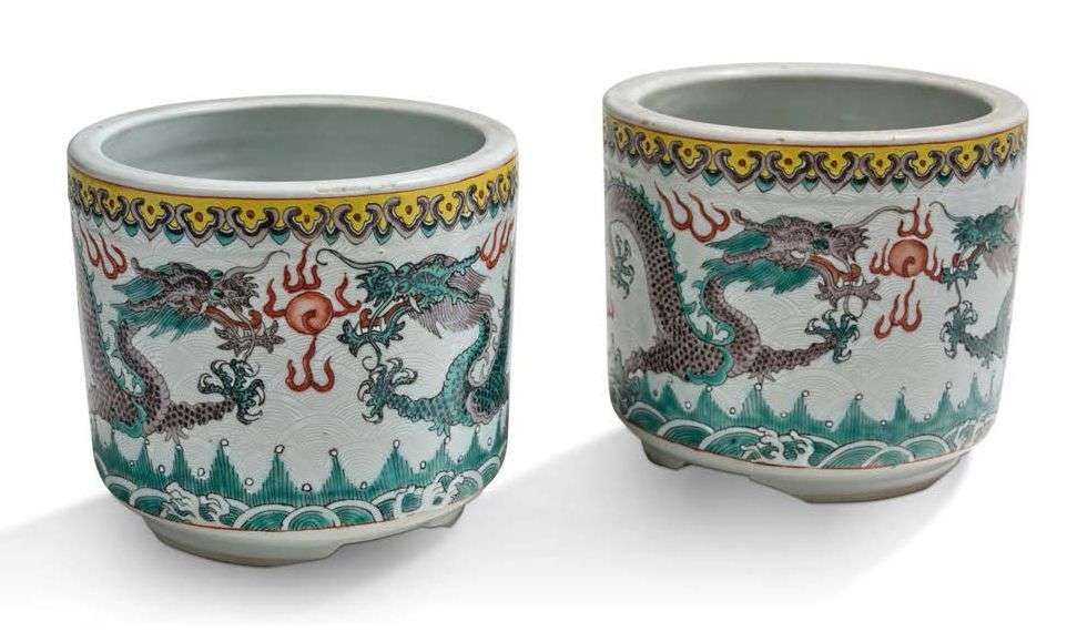 Paire de pots en porcelaine et émaux de la famille verte, à décor de dragons parmi des nuages, au-dessus de flots écumants, sur fond sgraffiato.