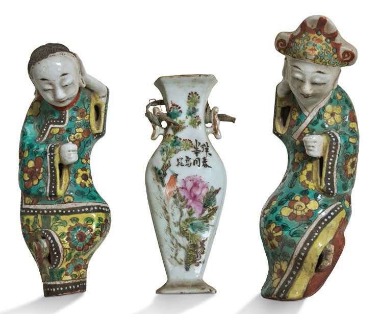 Trois sujets en porcelaine, dont un vase d'applique émaillé famille rose à décor d'oiseau et fleurs, et deux personnages allongés en porcelaine polychrome.