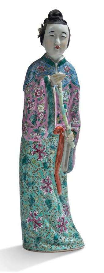 Sujet en porcelaine et émaux de la famille rose, représentant une jeune femme tenant un lotus.