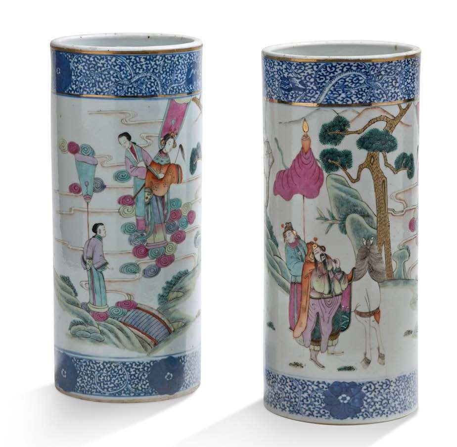 Paire de vases rouleaux en porcelaine et émaux de la famille rose et bleu sous couverte rehaussé d'or, à décor de dignitaires rendant visites à des divinités.