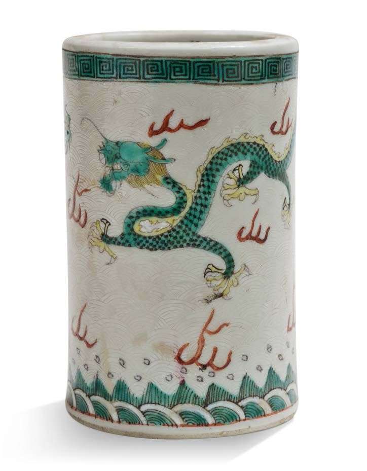 Porte-pinceaux en porcelaine et émaux de la famille verte, à décor sur fond sgraffiato de deux dragons poursuivant la perle sacrée parmi des nuages.