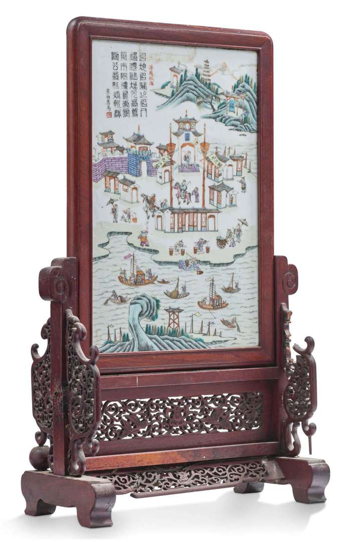 Écran en porcelaine et émaux de la famille rose, à décor d'un village et palais au bord d'un fleuve sur fond de pics montagneux, animés d'embarcations, paysans et cavaliers, avec poème calligaphié de Bai Ju Yi.