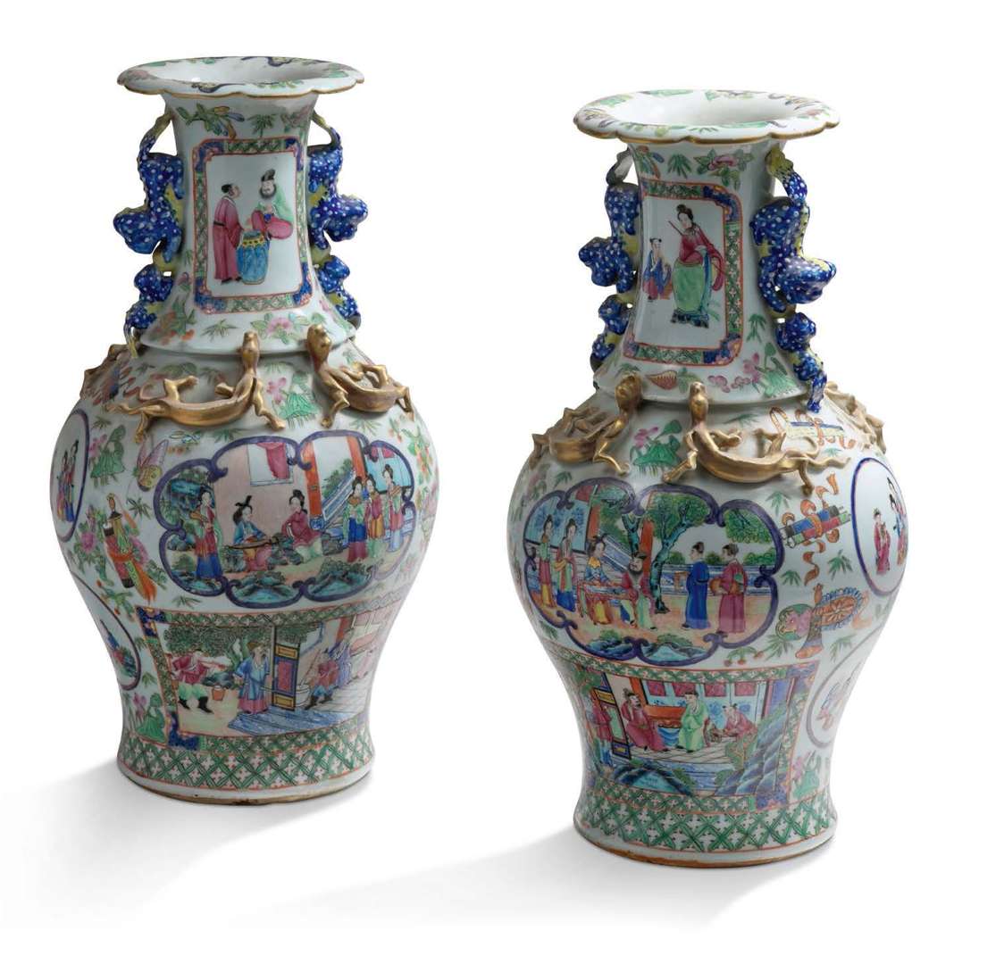 Paire de vases en porcelaine et émaux de la famille rose, à décor en médaillons de scènes de palais animés de dignitaires et jeunes femmes, sur fond d'objets précieux, papillons et fleurs. Le col est rehaussé de dragons, salamandres et lions bouddhIques en ronde-bosse.