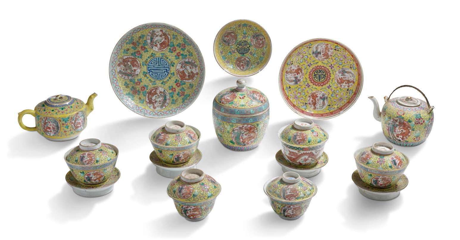 Ensemble de douze pièces en porcelaine, émaillées polychromes sur fond jaune comprenant trois assiettes, un pot couvert, cinq coupes couvertes dont quatre avec présentoir, une coupe, et deux théières, à décor de dragons et phénix dans des médaillons, parmi des rinceaux feuillagés. Marques Guangxu et Daoguang.