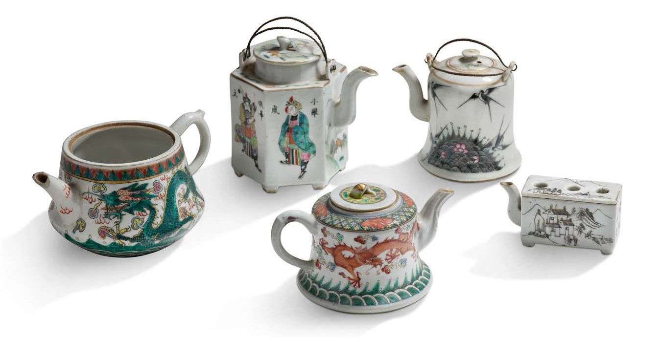 Lot de cinq théières en porcelaine, à décor polychrome dont deux ornées de dragons, une à décor de personnages, une à motifs de papillons| l'une quadrangulaire à décor en grisaille de pavillons.