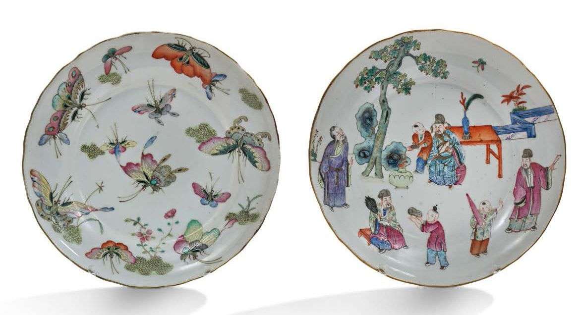 Deux assiettes en porcelaine et émaux de la famille rose, à décor de dignitaires et enfants dans un jardin pour l'une, et papillons pour l'autre.