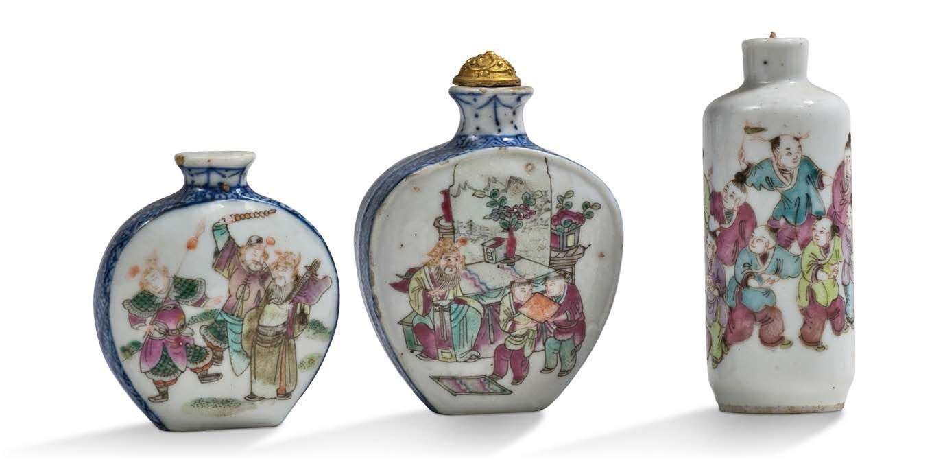 Ensemble de trois flacons-tabatières en porcelaine et émaux de la famille rose, à décor de dignitaires et enfants.