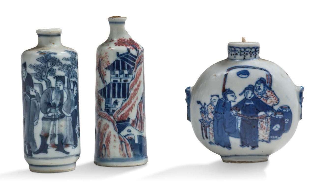 Ensemble de trois flacons-tabatières en porcelaine bleu-blanc et rouge de cuivre à décor de dignitaires et paysages montagneux.