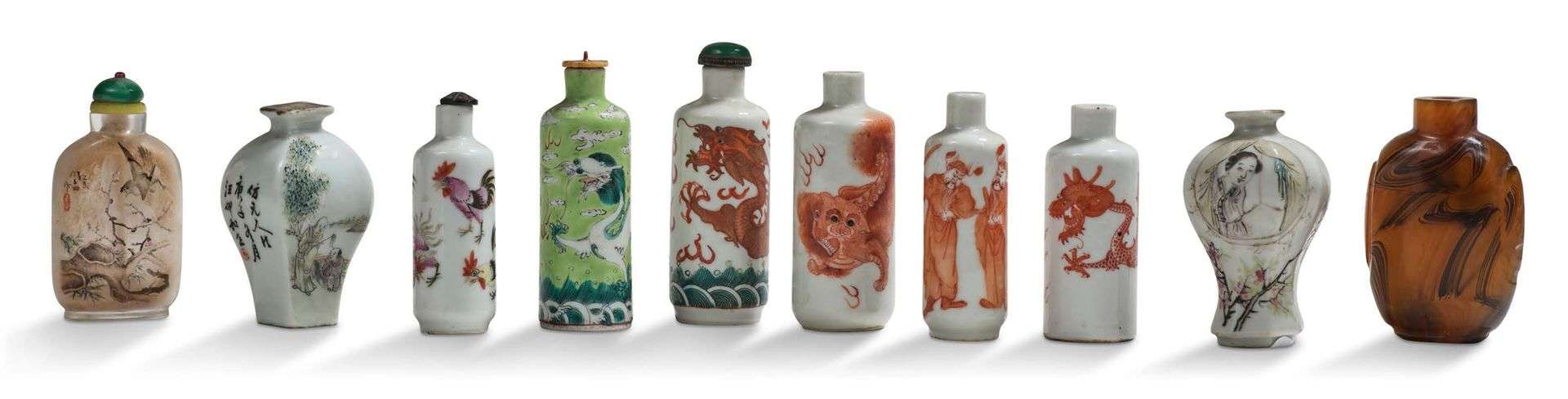 Ensemble comprenant dix flacons-tabatières dont quatre à décor émaillé corail de dragons, lions bouddhiques et dignitaires, quatre émaillés polychromes à motifs de coqs, paysages, personnages et dragons, et deux en verre, l'un peint à l'intérieur, l'autre à l'imitation de l'agate.