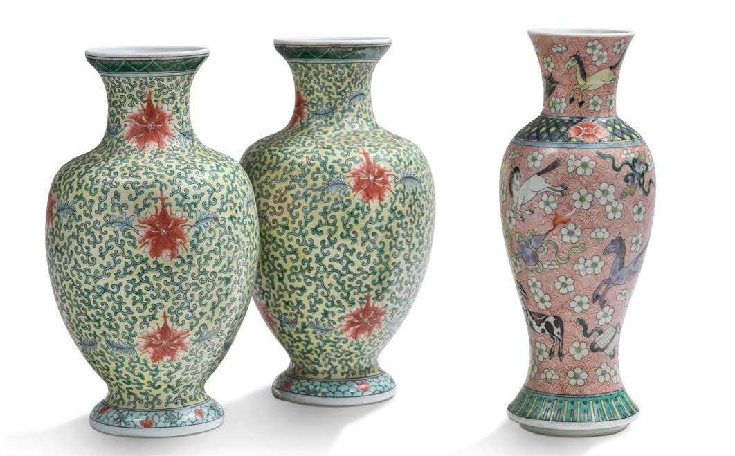 Trois vases en porcelaine et émail polychrome, dont une paire à décor de lotus émaillé corail sur fond de rinceaux feuillagés, et un vase à décor de chevaux parmi des fleurs de prunus sur fond de spirales.