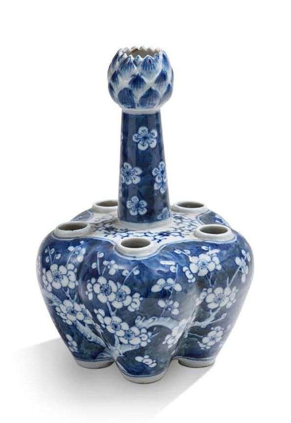 Bouquetière en porcelaine bleu-blanc, à décor de fleurs de prunus, l'ouverture en bouton de lotus.