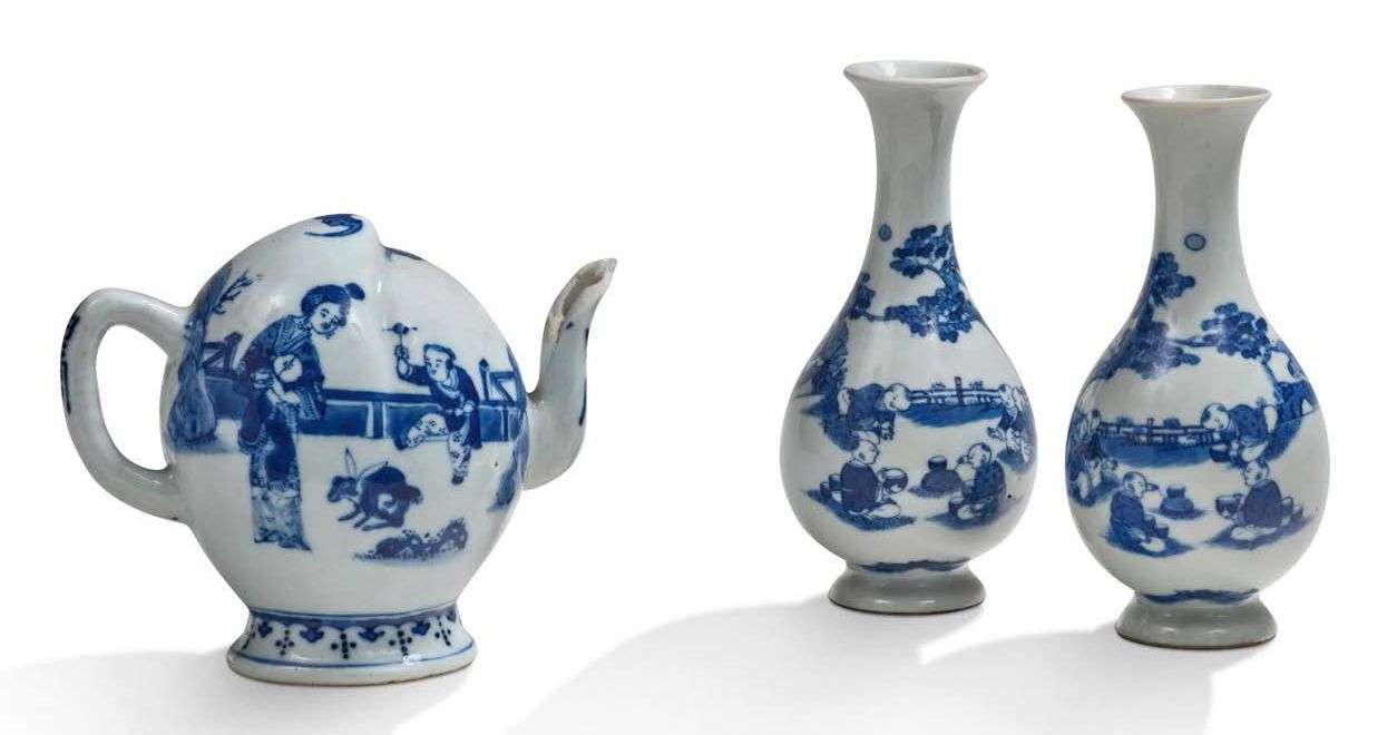 Paire de petits vases en porcelaine bleu-blanc à décor d'enfants.