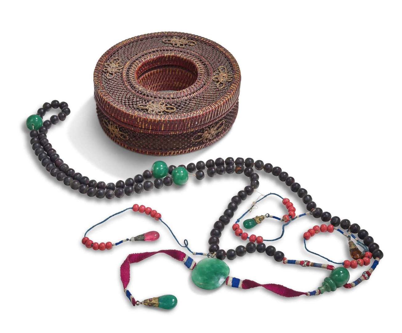 Collier de mandarin dans sa boite en osier, avec perles en verre à l'imitation de la jadéite.