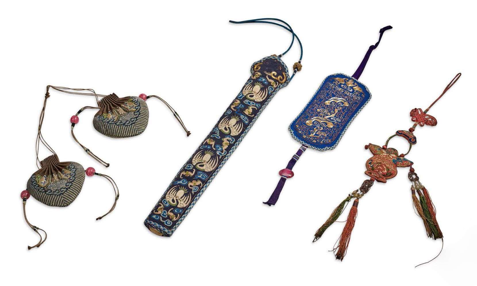 Ensemble de cinq pièces en textiles brodés aux fils d'or, comprenant un étui à éventail en soie brodée de fils bleu et beige, deux bourses, deux pendeloques, à décor divers de grues, lingzhi et motifs géométriques.