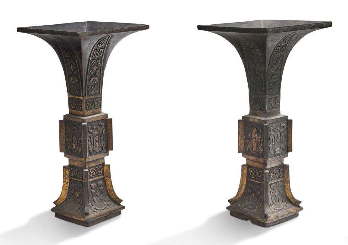 Paire de vases Gu en bronze avec traces de dorure, à décor archaïsant de feuilles de bananiers, masques de taotie stylisés et motifs géométriques.