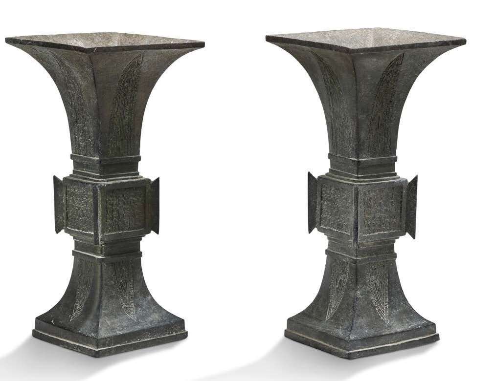 Paire de vases Gu en bronze, à décor archaïsant de leiwen et feuilles de bananier.