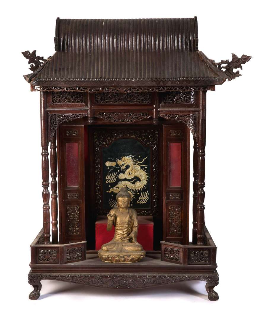 Temple en bois ajouré, surmonté d'un fronton, avec Bouddha en bronze, et écran à décor d'un dragon brodé à l'intérieur du temple.