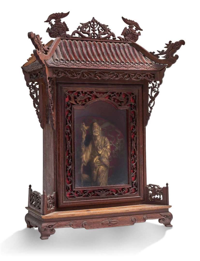 Petit temple en bois, formant vitrine, avec sujet en bois doré représentant Zhoulao.