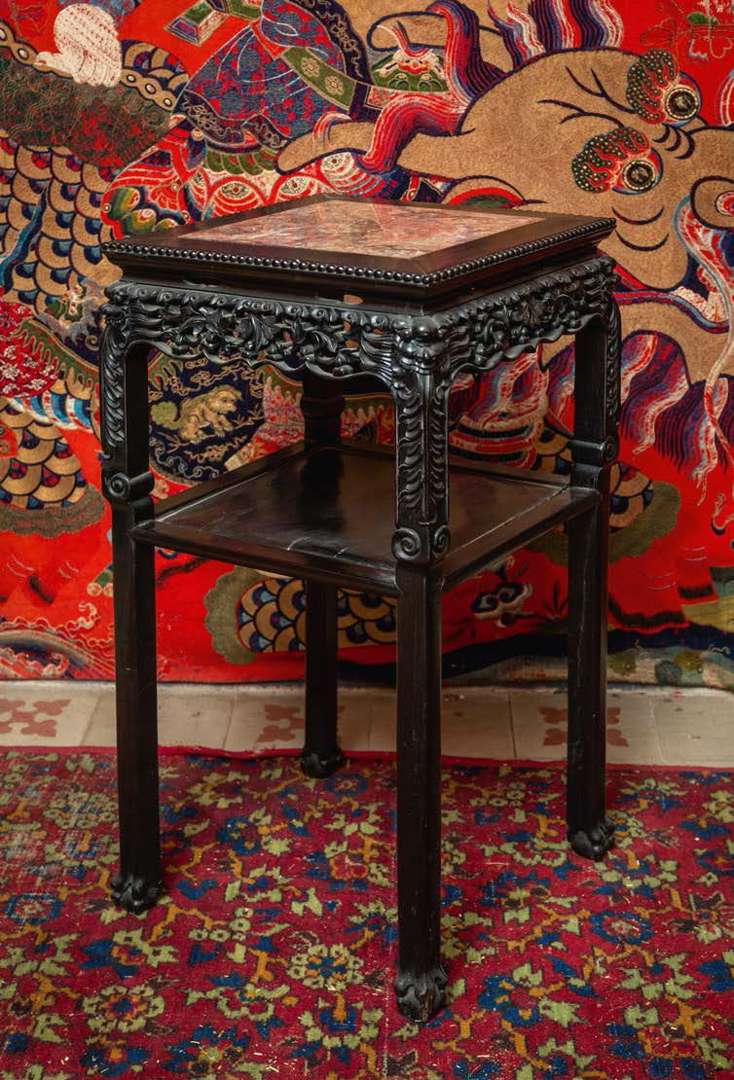 Sellette en bois, à deux plateaux, celui du dessus orné de marbre.