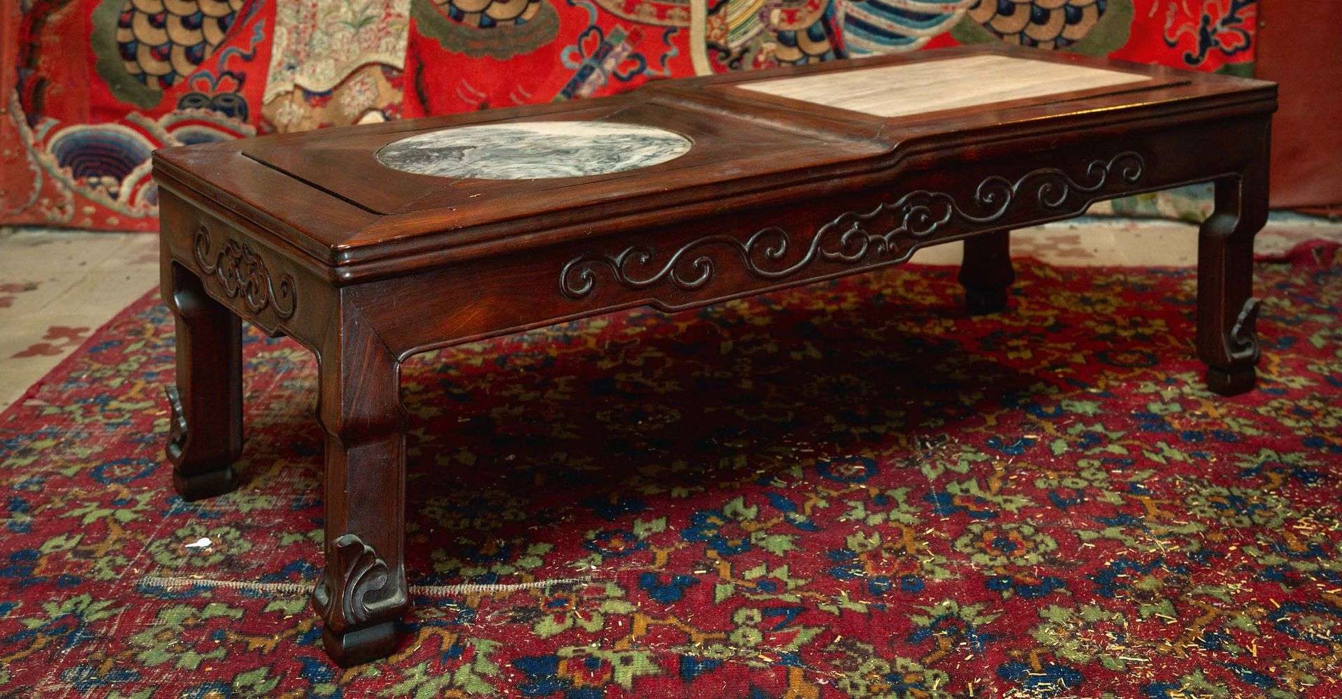 Table-basse en bois, ornée de deux pierres de rêves, l'une circulaire, l'une rectangulaire.