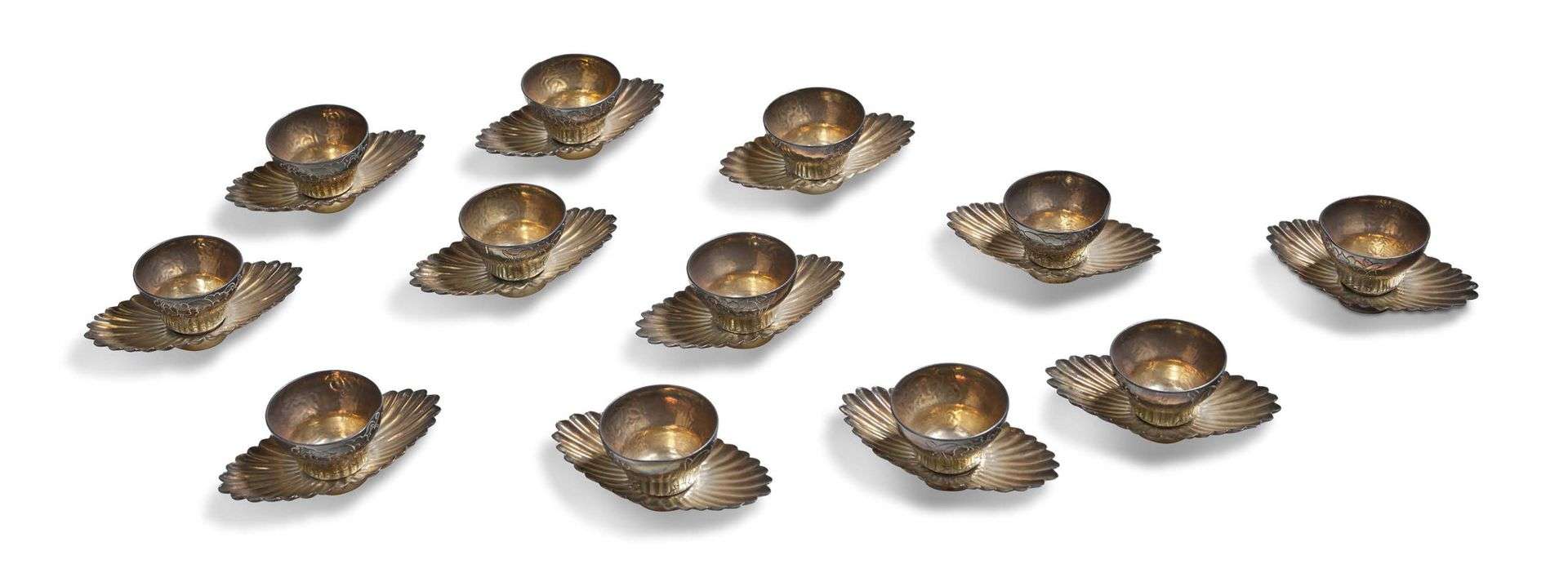 Ensemble de douze petites coupes à alcool avec chacune leur présentoir, à décor de canards et lotus. Poinçons à l'intérieur des soucoupes.