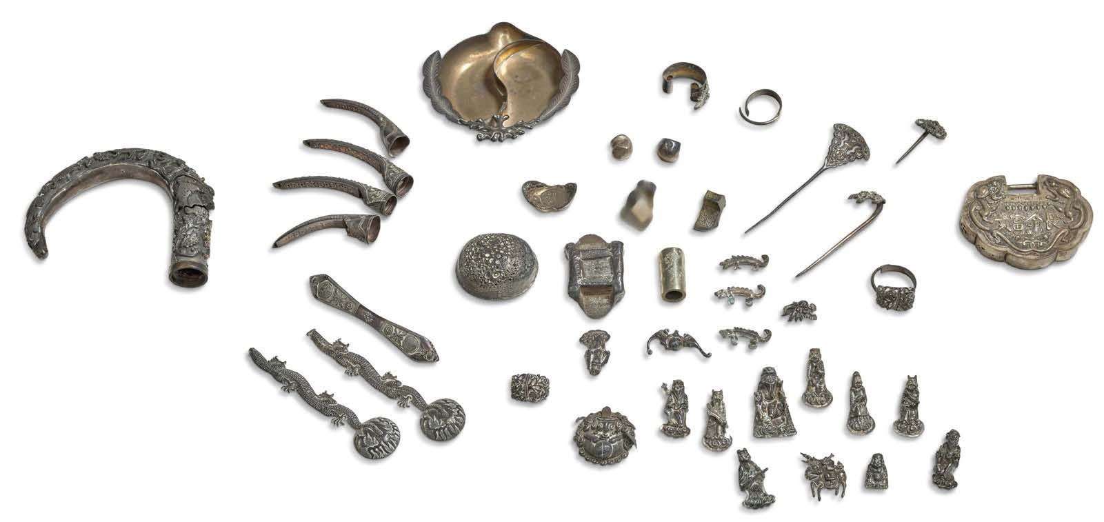 Lot de petits objets en argent, comprenant des ongles d'apparat, un manche de canne, une coupelle en forme de pêches, un diffuseur à parfum en forme de cadenas, des bagues, broches, petits sujets et lingots.