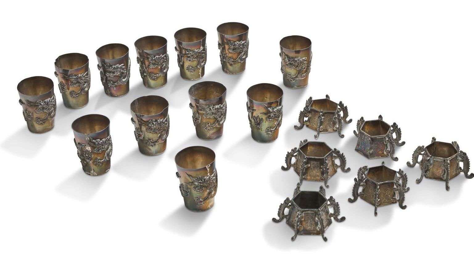 Ensemble comprenant douze gobelets en argent à décor de dragons poursuivant la perle sacrée, six porte-bougeoires à décor de dragons.