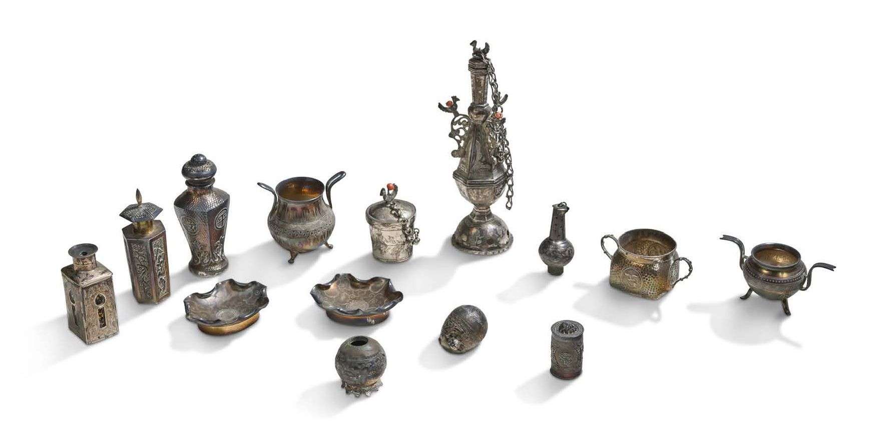 Ensemble de quatorze petits objets en argent, dont paire de coupelles, salière et poivrière, flacons, vase pour l'essence de rose, petites boîtes, brûle-parfum miniature.