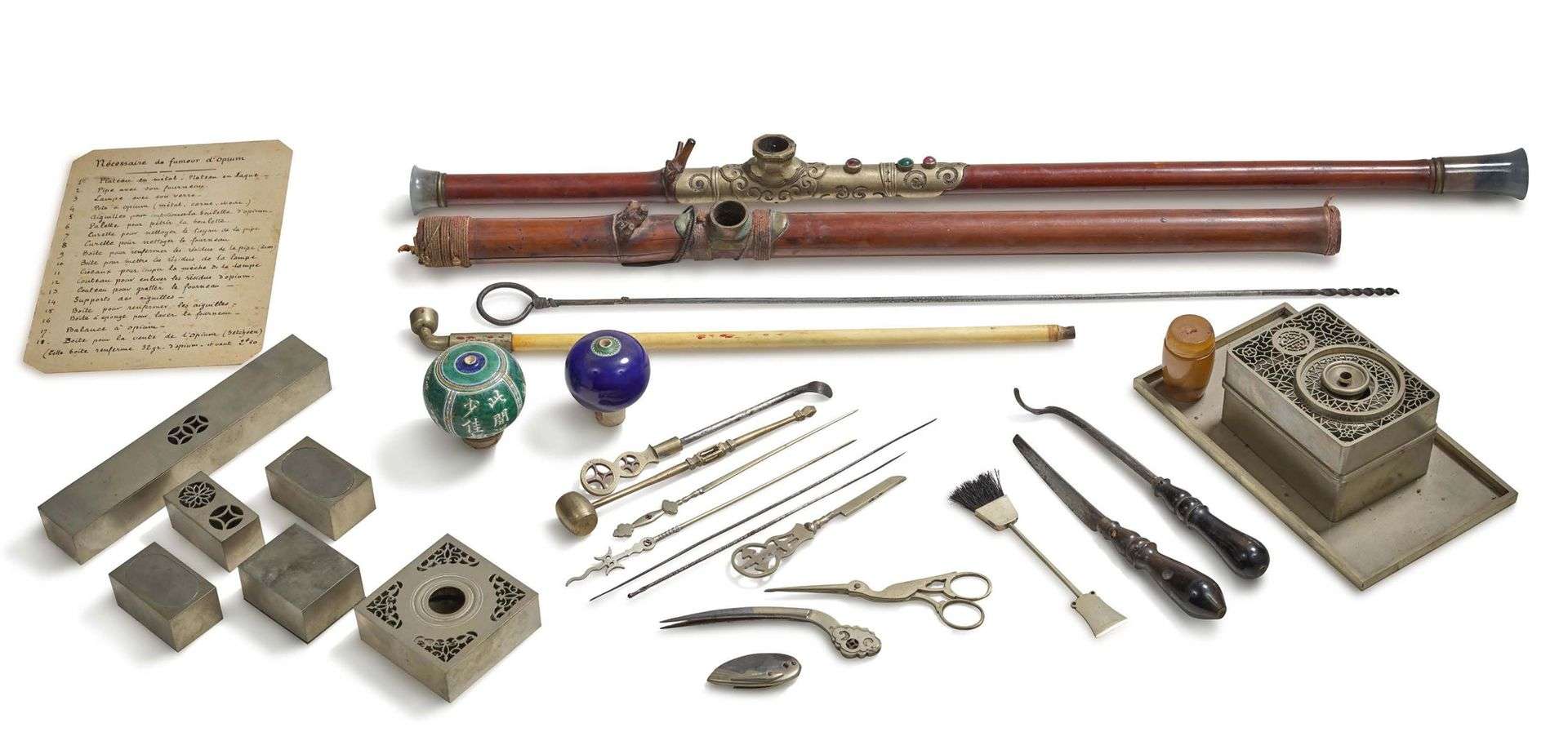 Lot comprenant trois pipes à opium en bambou, l'une avec embouts en jadéite, et nécessaire de fumeur d'opium, avec six boîtes, outils à cureter, deux fourneaux, un plateau, une boîte en corne, une paire de ciseaux, un couteau.